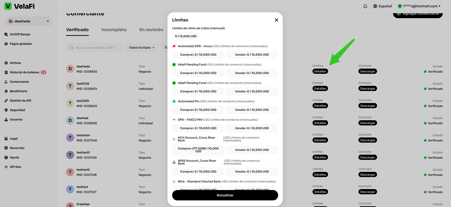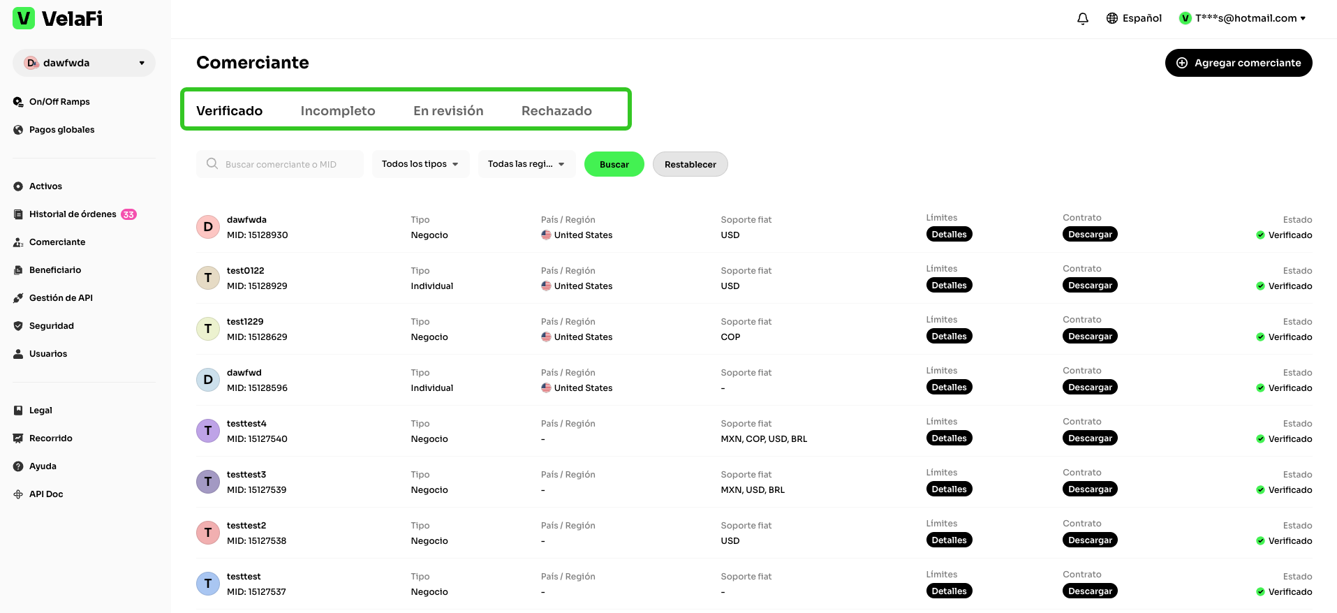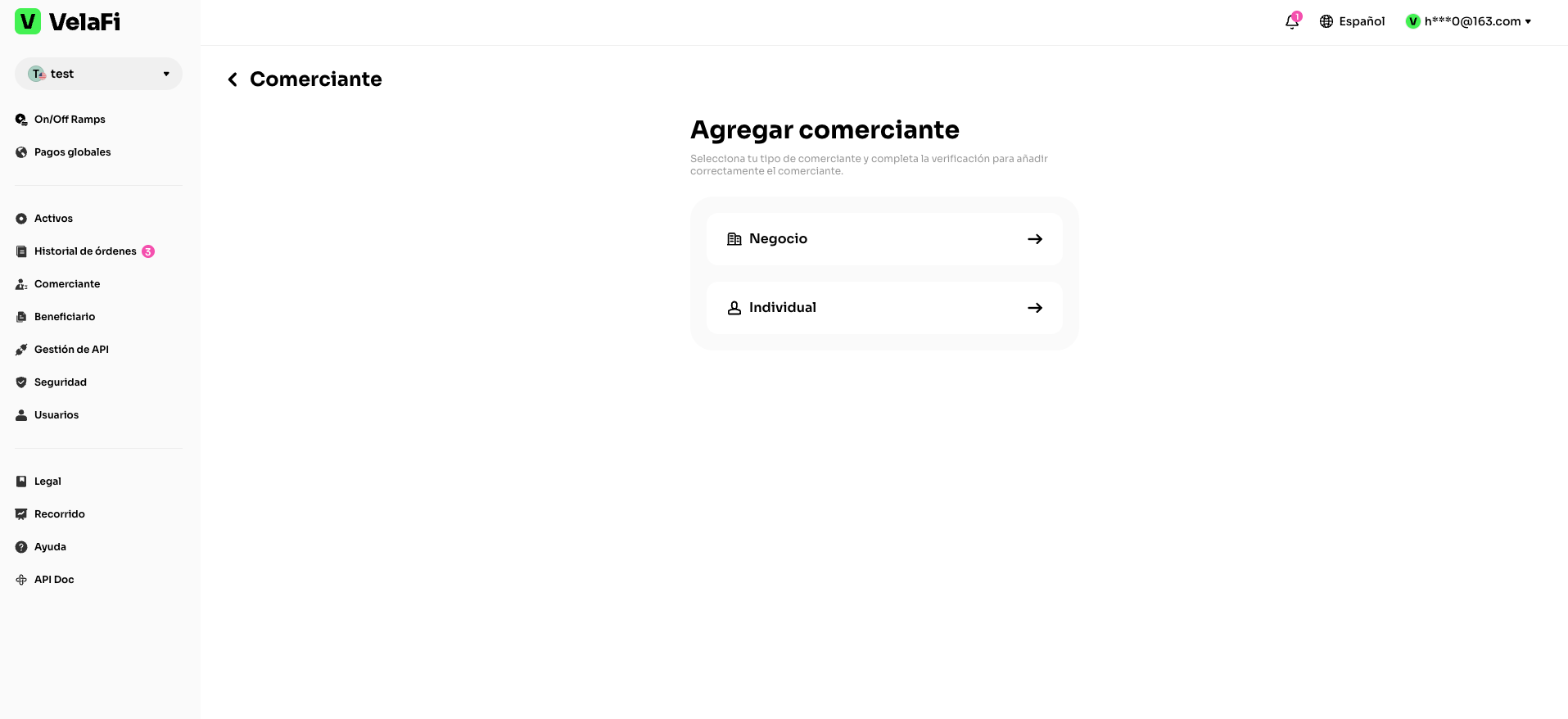 Un comerciante es un individuo o entidad legal asociada a una cuenta única dentro de la plataforma, autorizada para operar tras completar y aprobar con éxito el proceso de verificación KYC (Conoce a tu Cliente) o KYB (Conoce a tu Negocio) correspondiente.