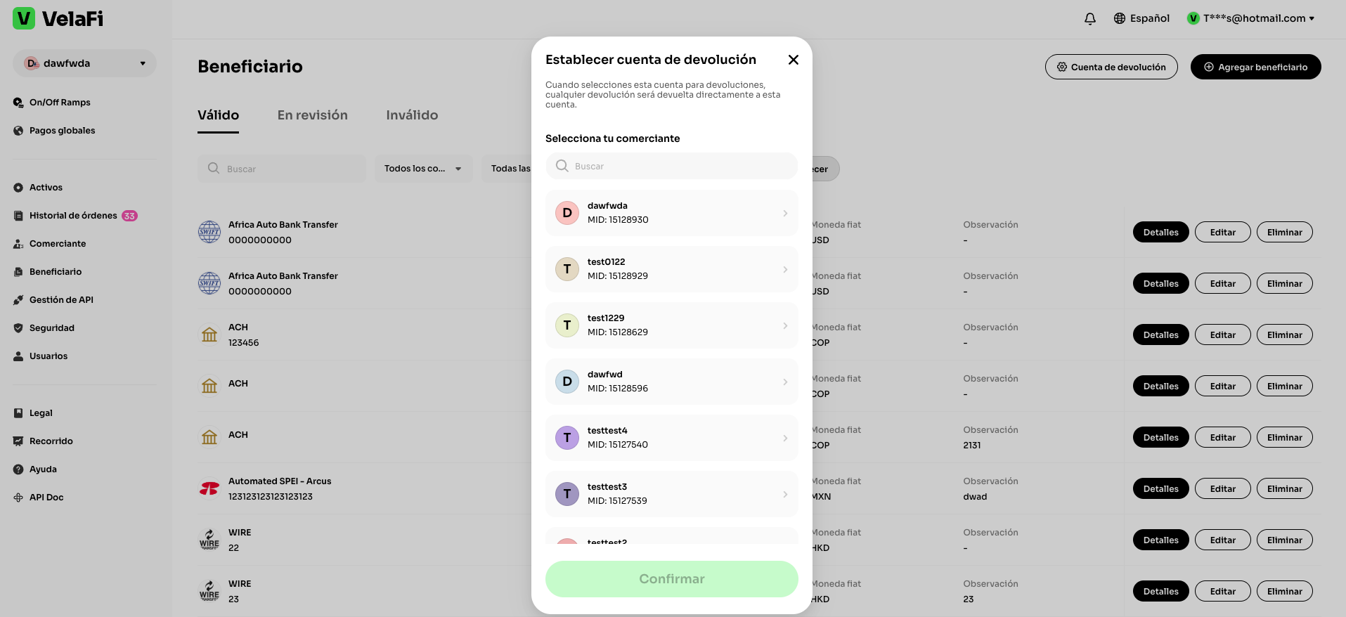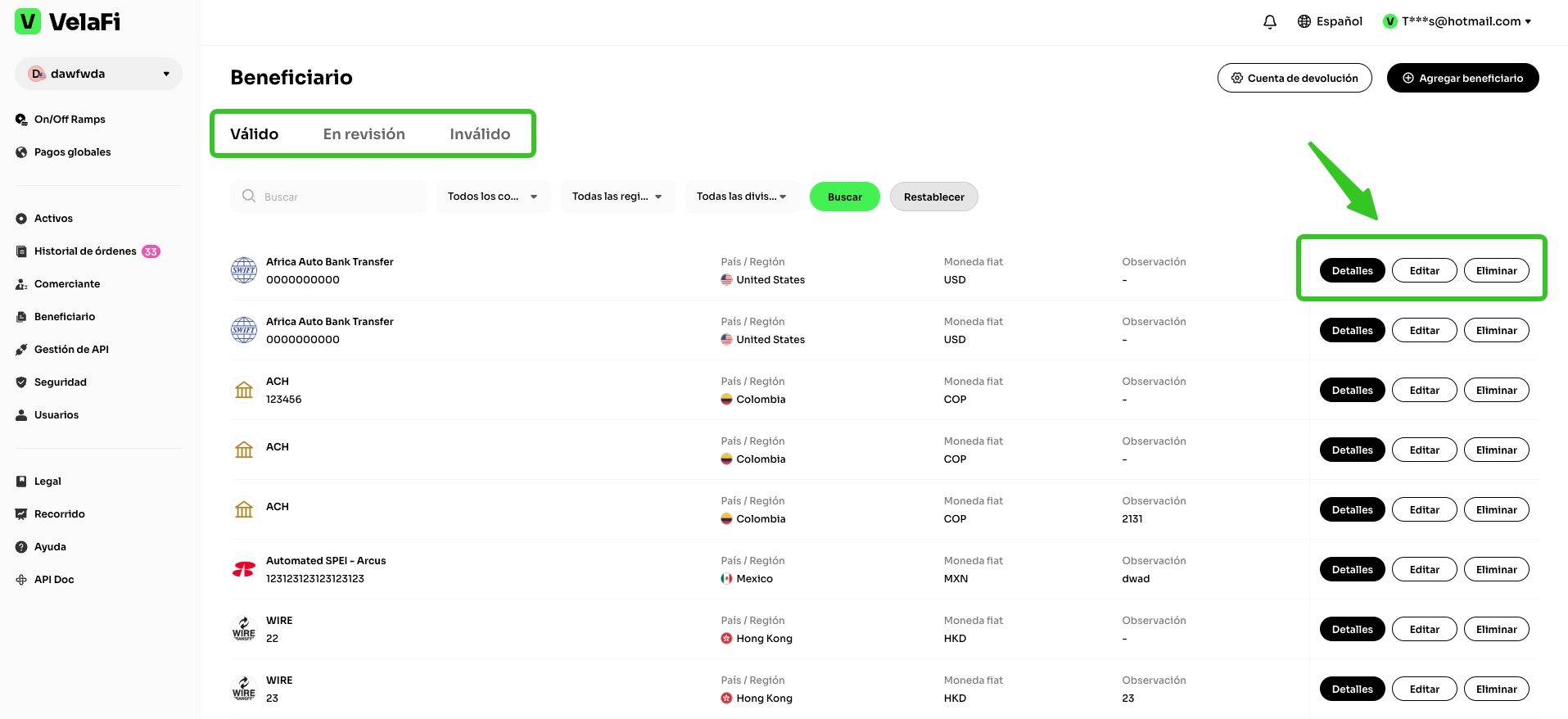 En la sección de 'Beneficiario', podrás ver la información detallada de las cuentas beneficiarias que hayas agregado, así como editar y eliminar estas directamente. También puedes consultar aquellas que se encuentren en revisión o que sean inválidas.