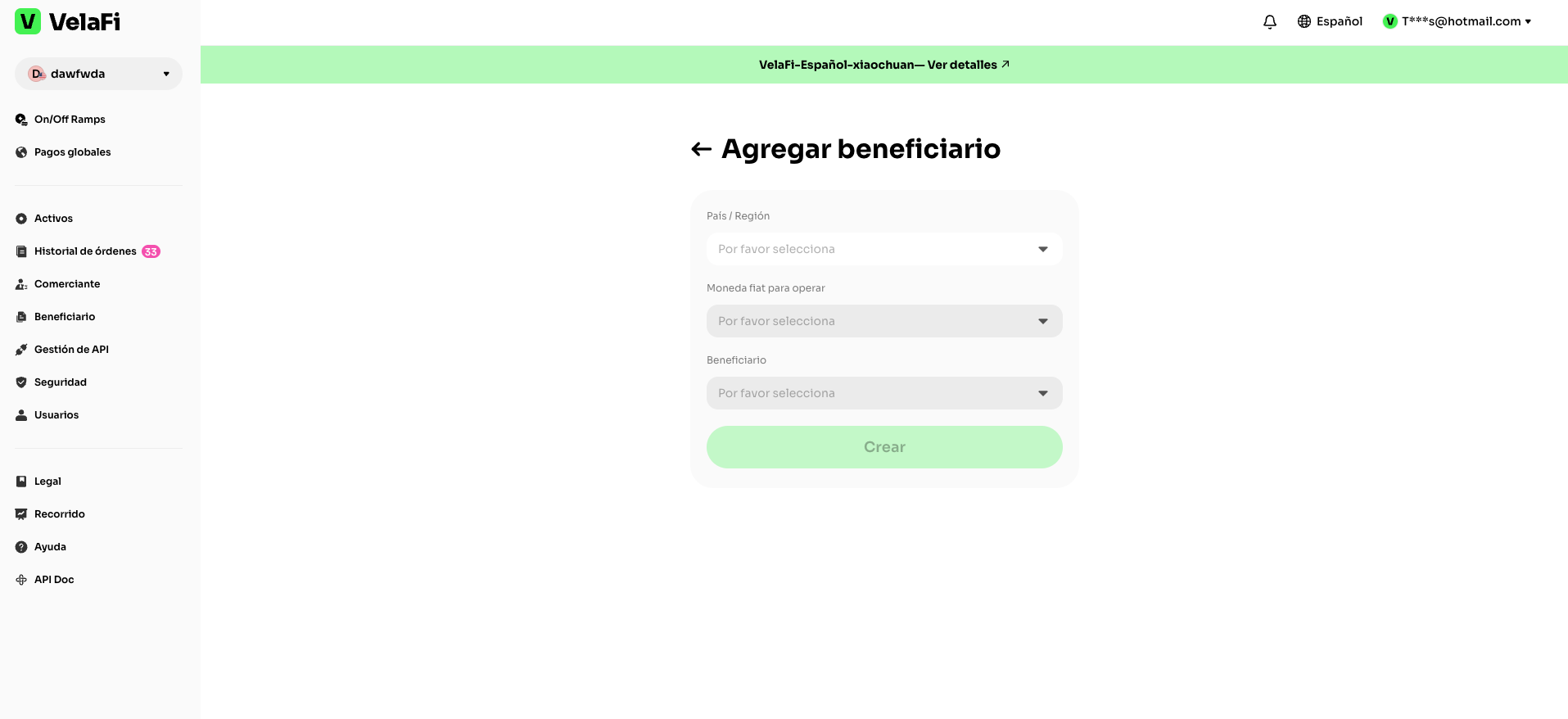 Para agregar un nuevo beneficiario, presiona el botón 'Agregar beneficiario' ubicado en la esquina superior derecha y completa el proceso.