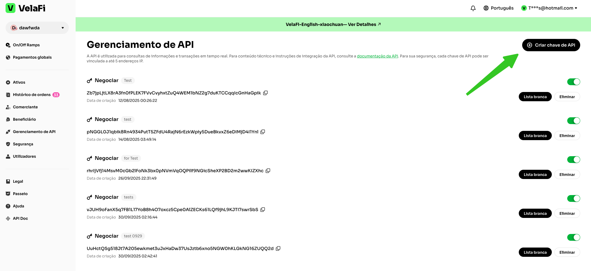 Na seção de 'Gerenciamento de API', você poderá criar várias Chaves de API para auxiliá-lo nas operações técnicas. Para conteúdo técnico e instruções de integração da API, consulte a documentação da API.