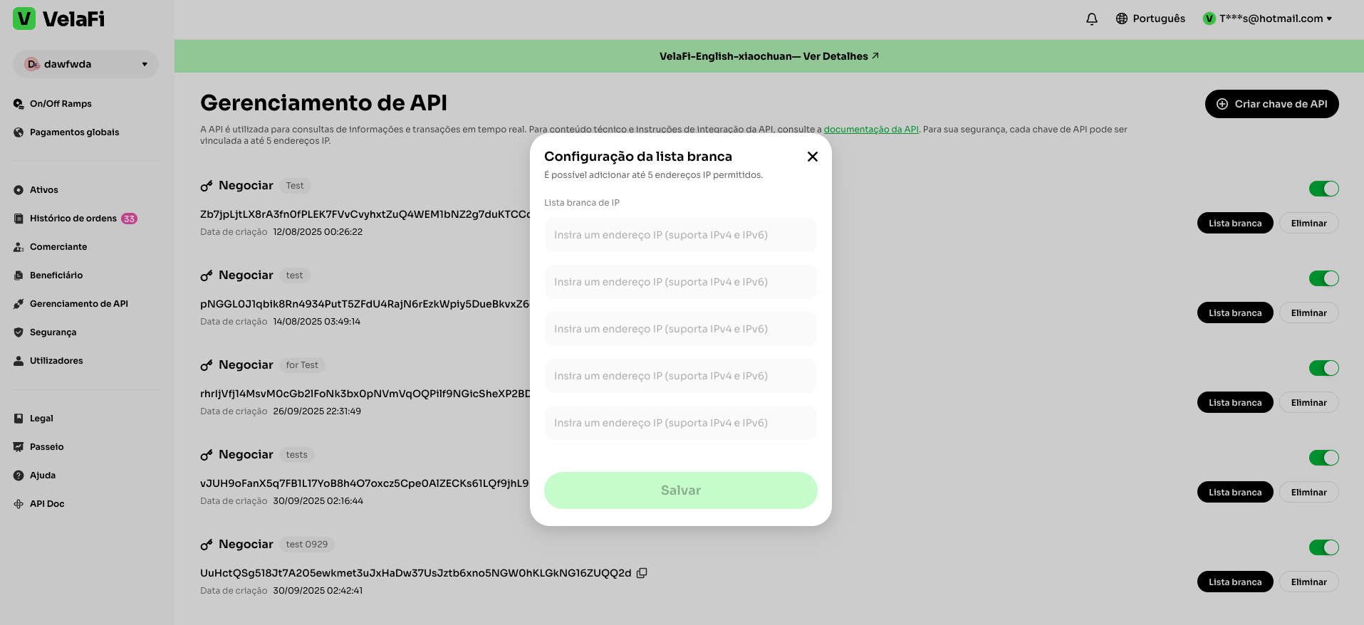 Dicas: Para sua segurança, cada chave de API pode ser vinculada a até 5 endereços IP.