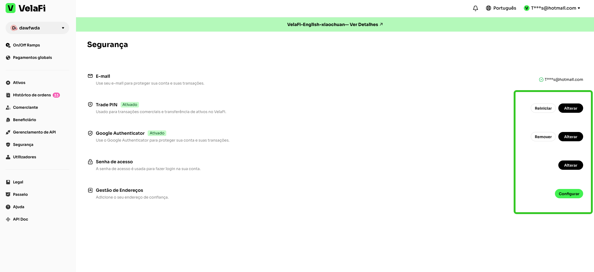 Na seção de 'Segurança', você poderá visualizar as informações de segurança vinculadas à sua conta, incluindo seu e-mail, Trade PIN, Google Authenticator, senha de acesso e endereços de carteira de criptomoedas. Você também poderá configurar, reassociar e excluir esses dados de segurança diretamente.