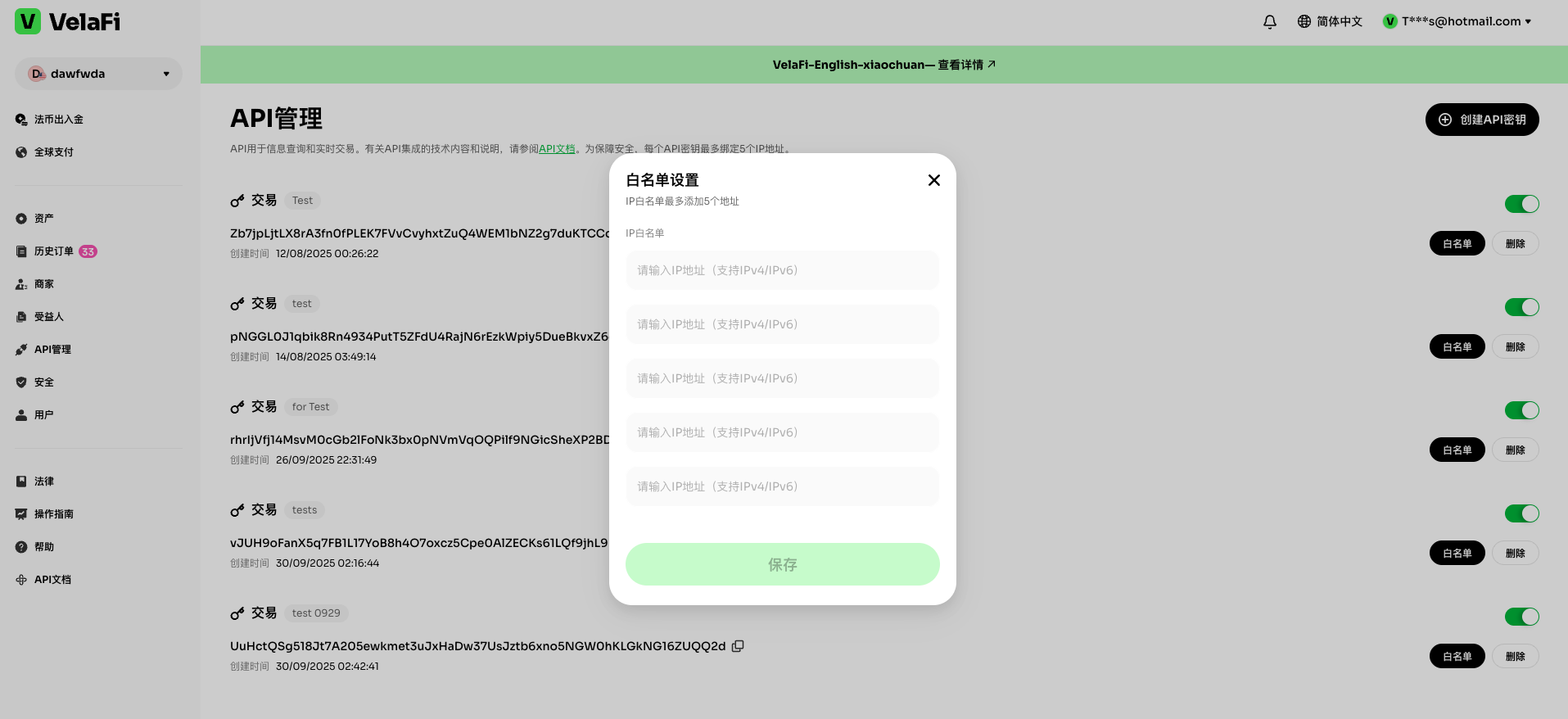 API管理 2026年01月29日 03:17 更新 在「API管理」板块,您可创建多个API密钥来进行信息查询和实时交易。有关API集成的技术内容和说明,请参阅 Velafi API 文档。 提示:为保障安全,每个API密钥最多绑定5个IP地址。 相关文章 安全