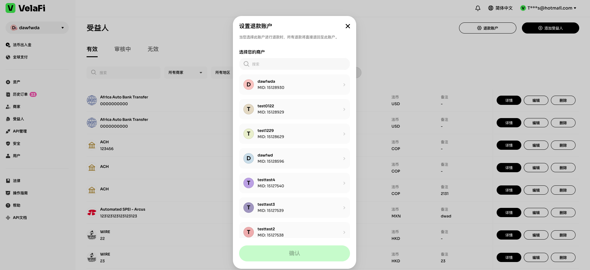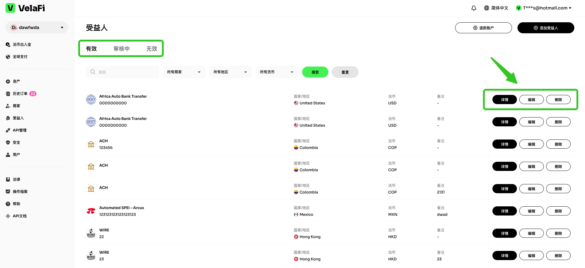 受益人 2026年01月29日 02:11 更新 「受益人」指用于接收法币资金的银行账户或金融账户。 受益人不进行平台操作,仅作为付款或结算的资金接收账户。 在「受益人」板块,您可查看已添加的法币收款账户的详细信息,并对该类账户执行编辑、删除操作;同时也可查询处于审核中或已失效状态的收款账户。 此外,您还可以设置自己的退款账户,以便在转账失败时接收退回的资金。 如需新增受益人,您可以点击页面右上方的「添加受益人」,之后按提示完成操作即可。 相关文章 添加受益人 API管理